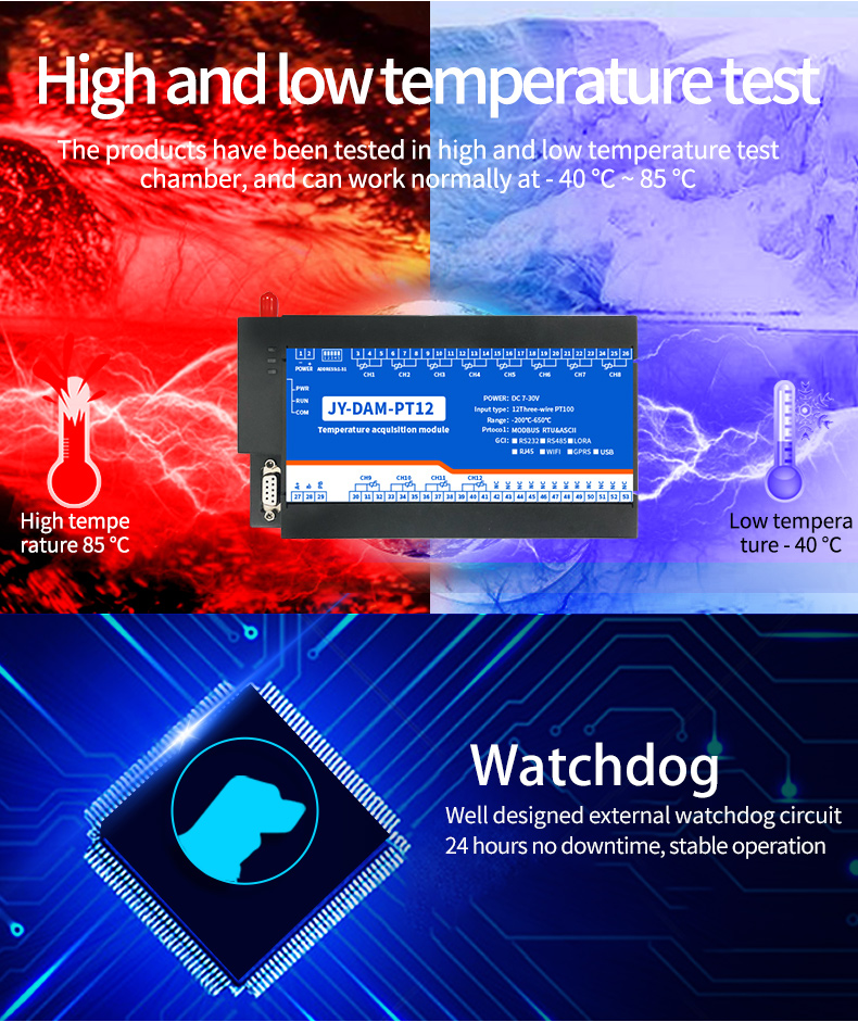 High precision 24 bit AD conversion resolution 0.01The temperature measure ment accuracy is 0.1℃Acquisition frequency 10HzSupport multi-channel simultaneous acquisitionThe device is compatible with twowire and three wire PT100 sensors