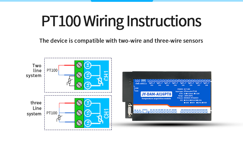High precision 24 bit AD conversion resolution 0.01The temperature measure ment accuracy is 0.1℃Acquisition frequency 10HzSupport multi-channel simultaneous acquisitionThe device is compatible with twowire and three wire PT100 sensors